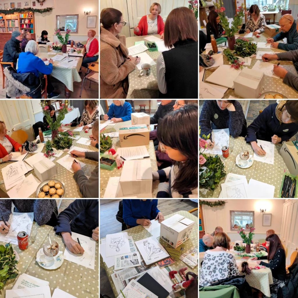 New workshops this year are Victorian cardmaking (taught by Jenny Ball), Watercolour Wreath painting (with Sam Basnett), paper wreath making for children with Jessica Hartshorn, drawing cartoon vegetables (with Matt Pooley). We are still finalising the programme but expect to also have old favourites rag rugging (with Chris Pegler), making paper hats (with Steve Davies), fabric wraps (with Lee Becker) and mindful drawing (with Gemma Whitford). In a special 2025 twist Tamsen Flack is showing us how to paint on silk across two days – large project! – including one where she will be dressed in steampunk costume.